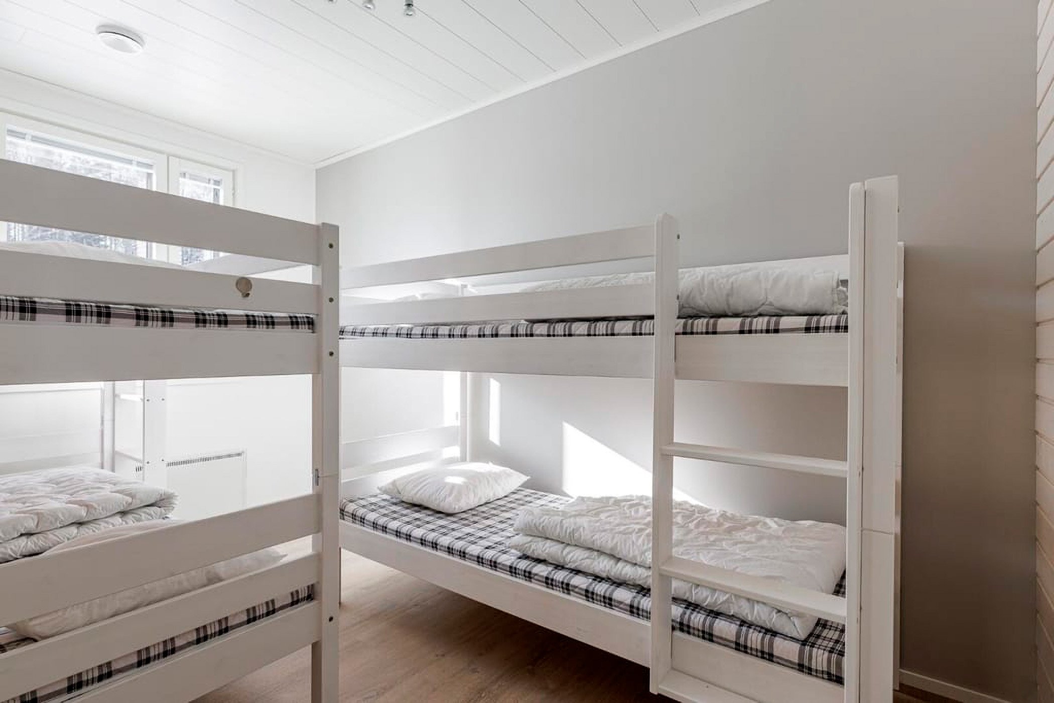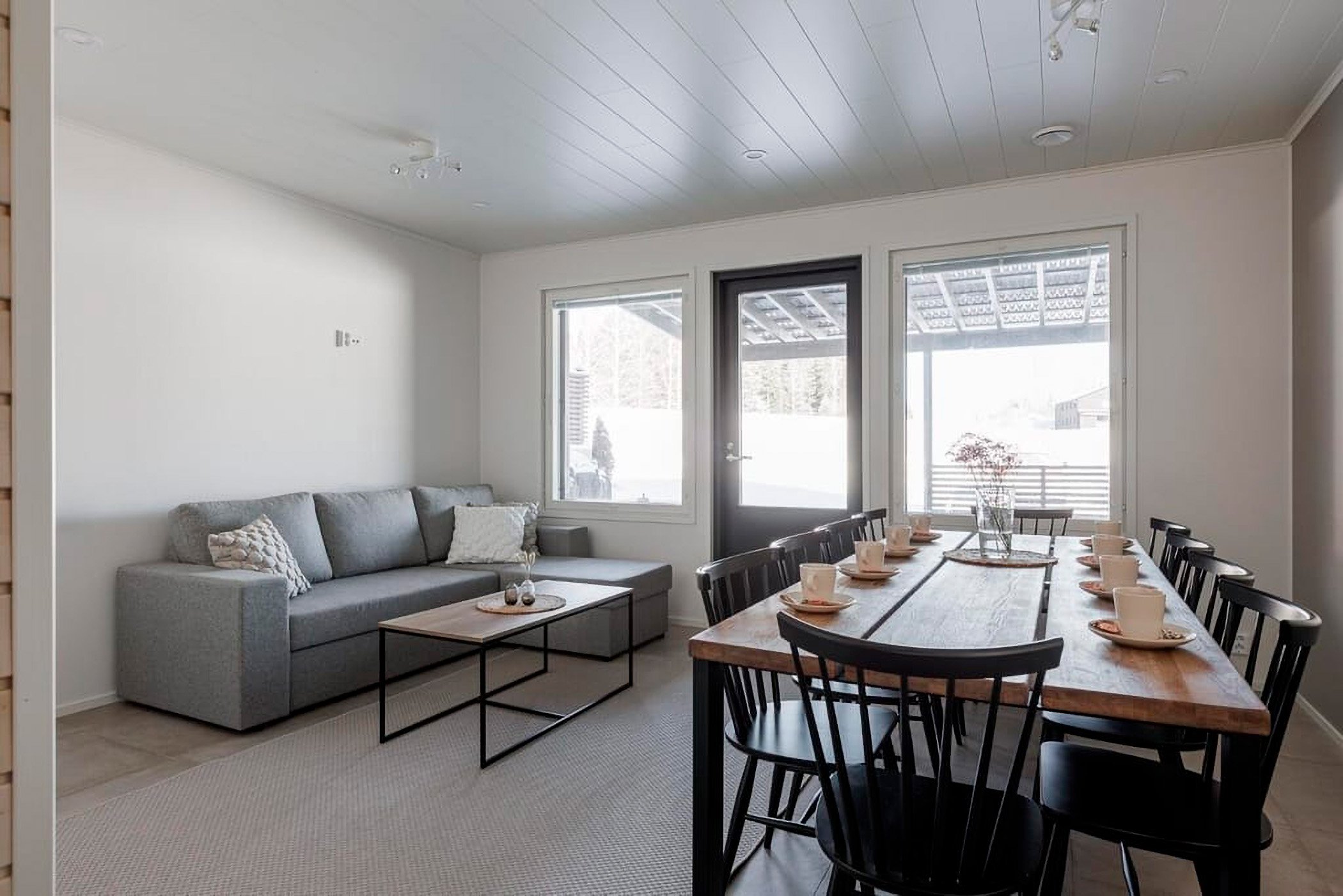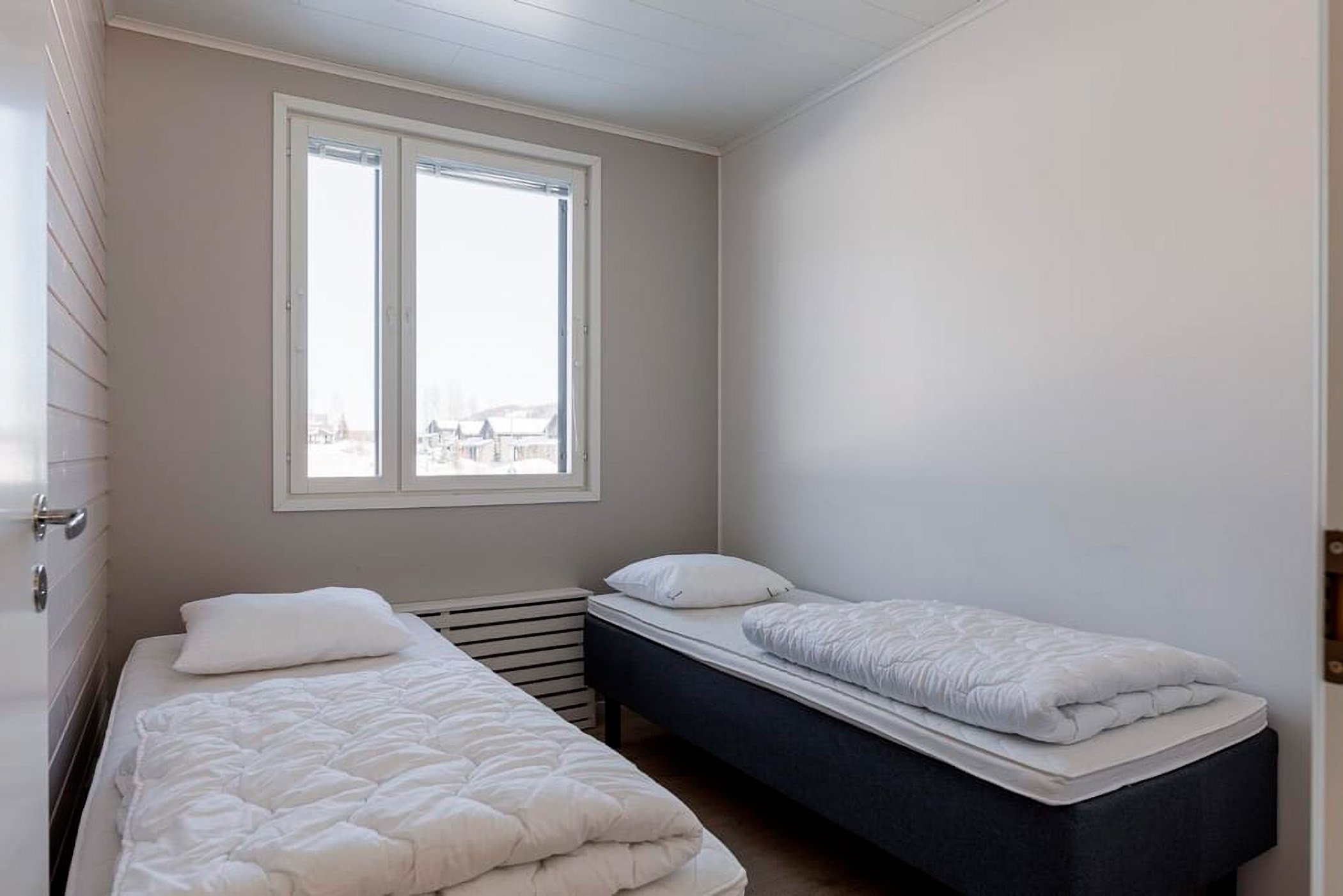 Huvilan pihassa on reilusti tilaa autoille sekä lämmitystolppa jokaiselle huoneistolle. Huoneiston alakerrassa on olohuone, keittiö sekä kylpyhuone ja sauna, josta pääsee kätevästi terassille ja ulkoporealtaaseen. Yläkerrassa on neljä makuuhuonetta, joista kolmessa on kaksi erillistä vuodetta. Yhdessä makuuhuoneessa on kaksi kerrossänkyä. Lisäksi alakerran olohuoneessa on levitettävä vuodesohva kahdelle hengelle. Kummassakin kerroksessa on lisäksi wc.