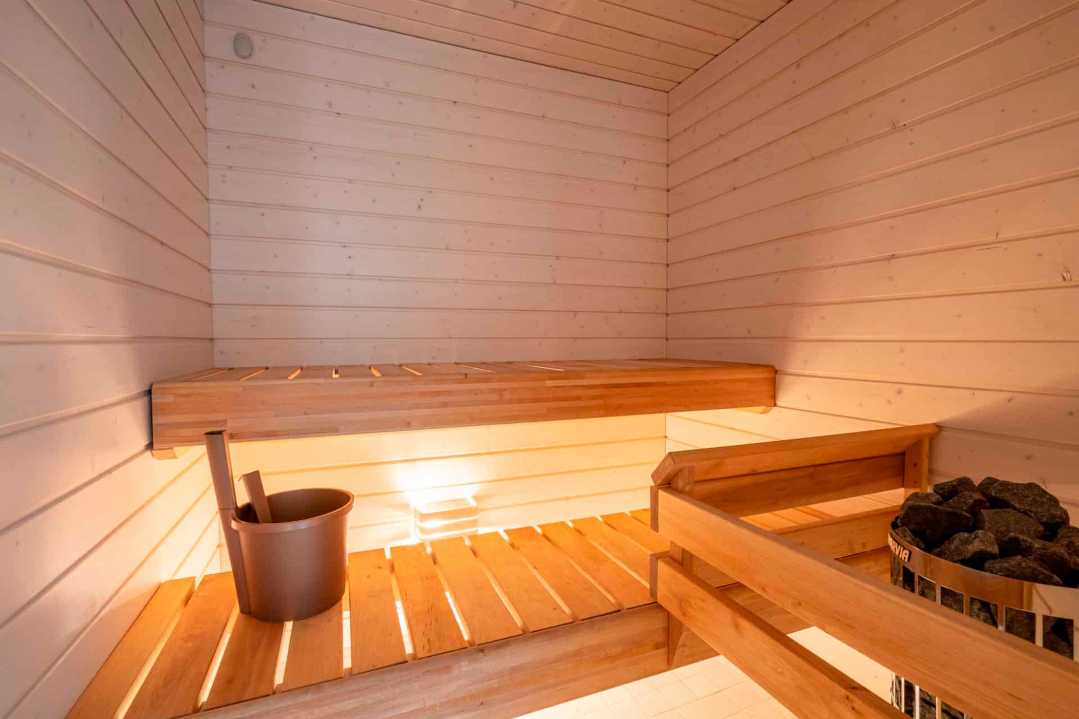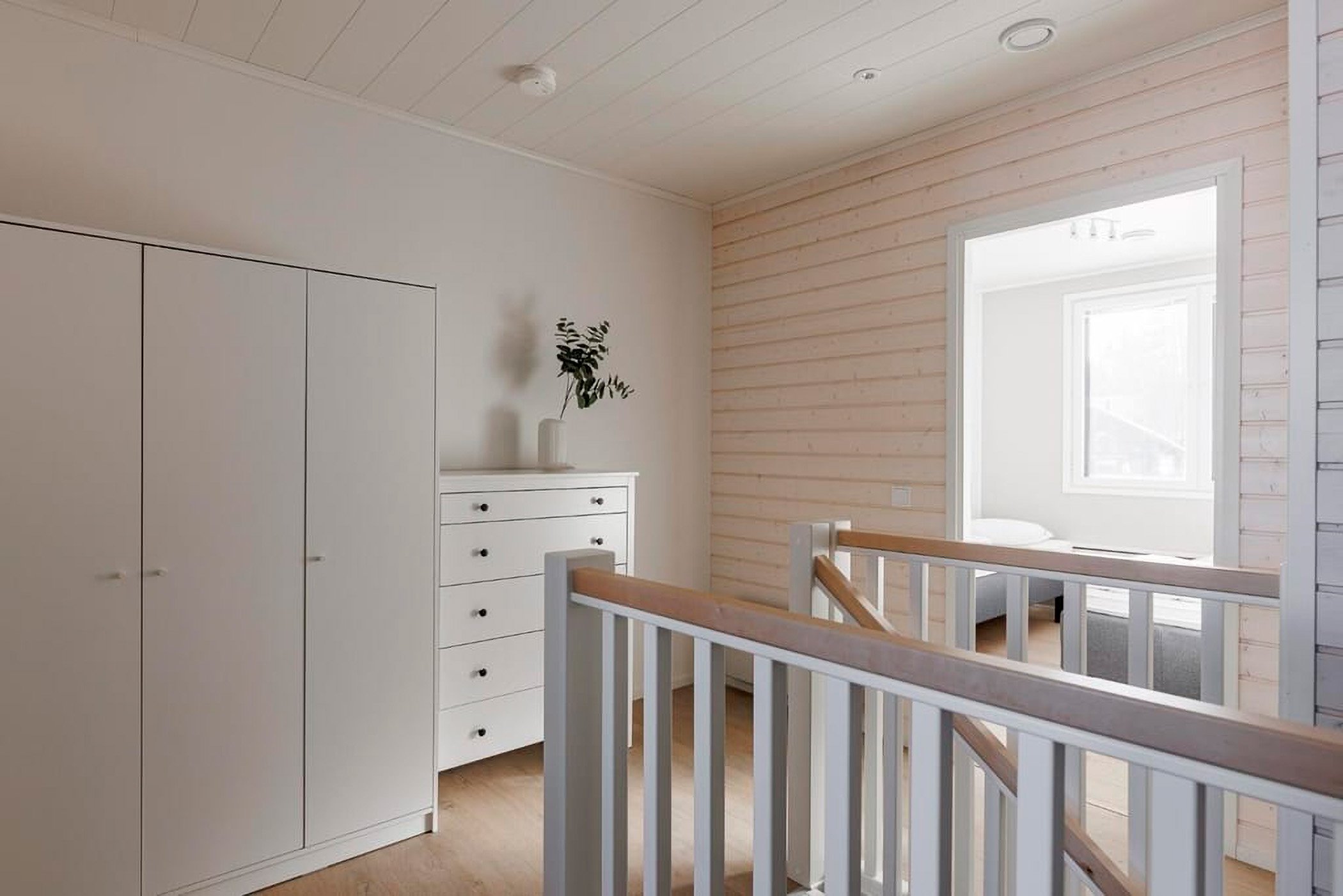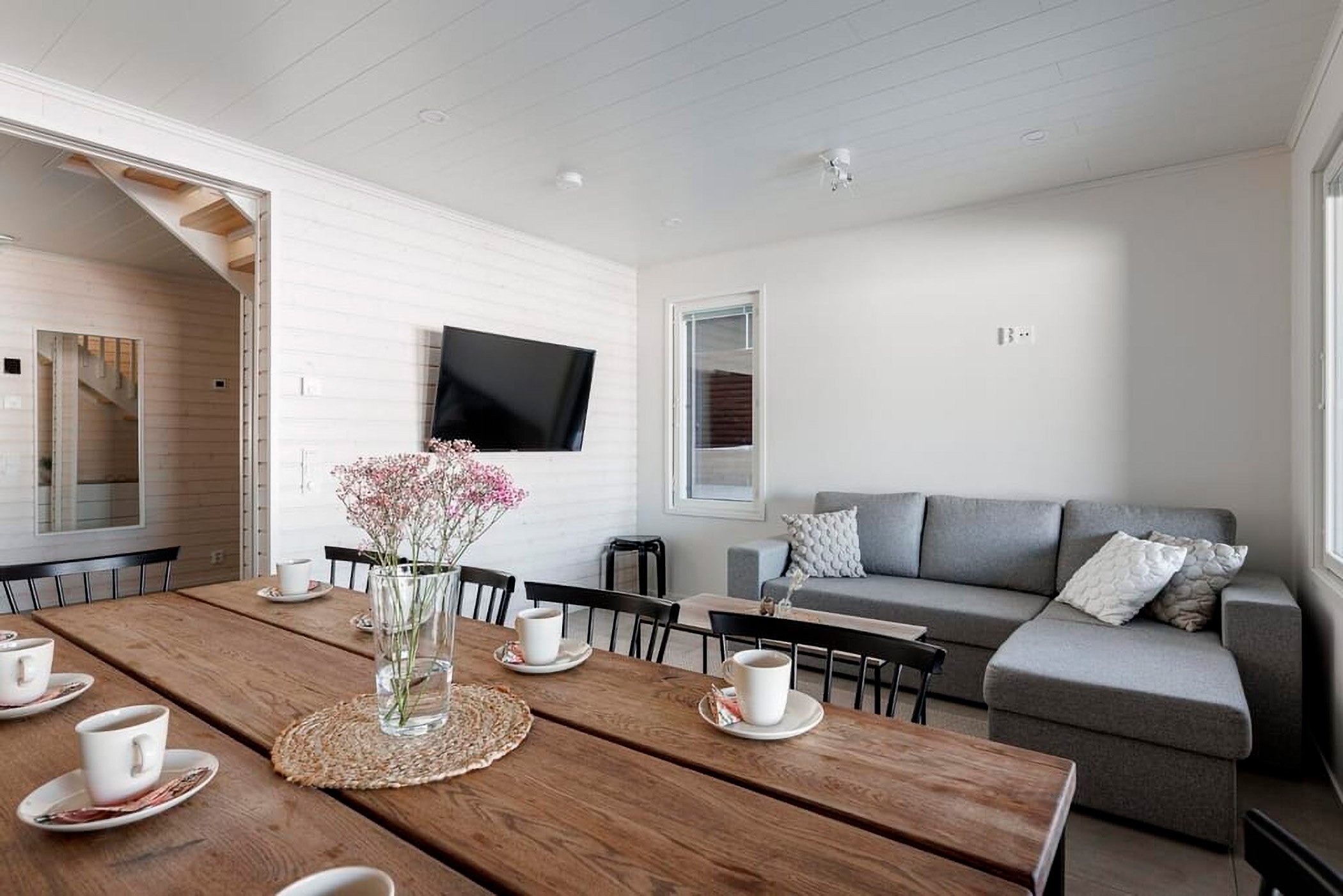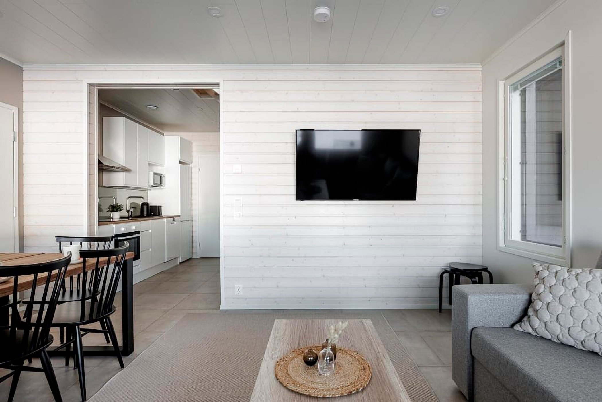 Huvilan pihassa on reilusti tilaa autoille sekä lämmitystolppa jokaiselle huoneistolle. Huoneiston alakerrassa on olohuone, keittiö sekä kylpyhuone ja sauna, josta pääsee kätevästi terassille ja ulkoporealtaaseen. Yläkerrassa on neljä makuuhuonetta, joista kolmessa on kaksi erillistä vuodetta. Yhdessä makuuhuoneessa on kaksi kerrossänkyä. Lisäksi alakerran olohuoneessa on levitettävä vuodesohva kahdelle hengelle. Kummassakin kerroksessa on lisäksi wc.
