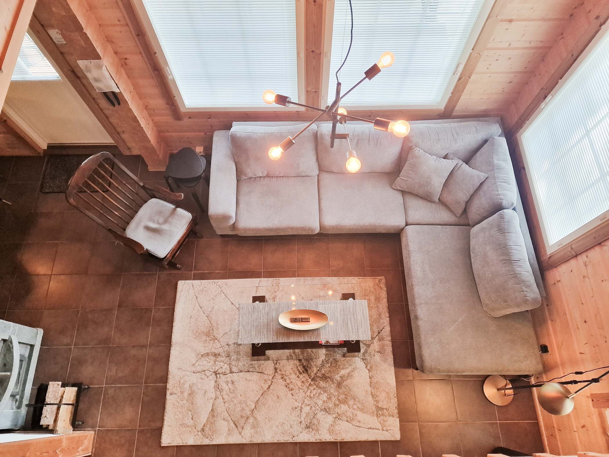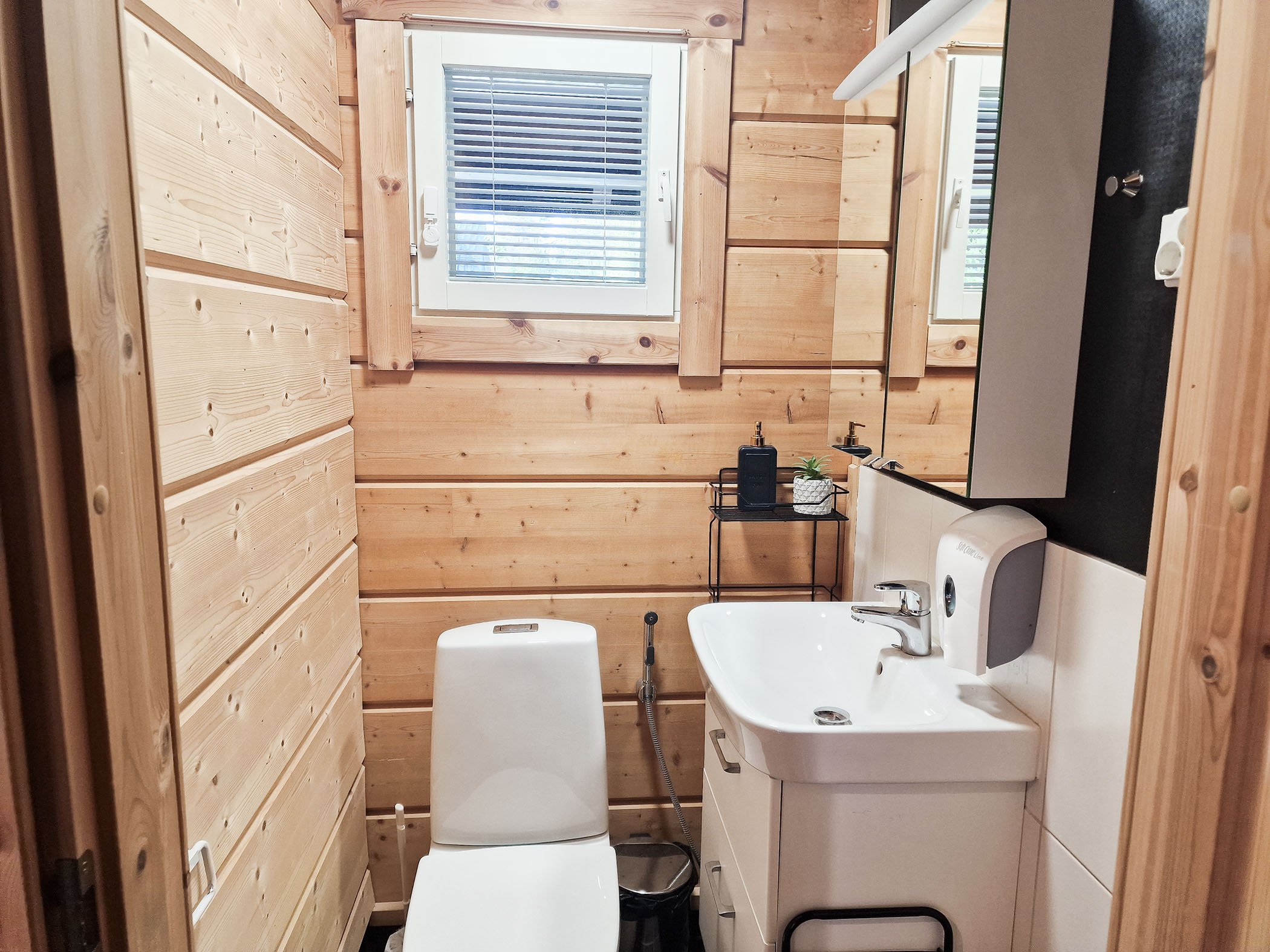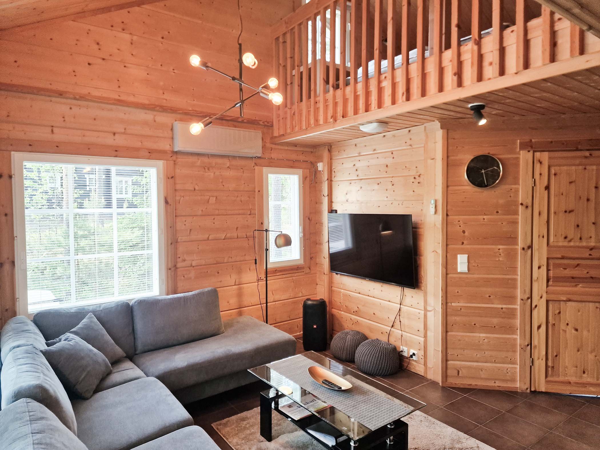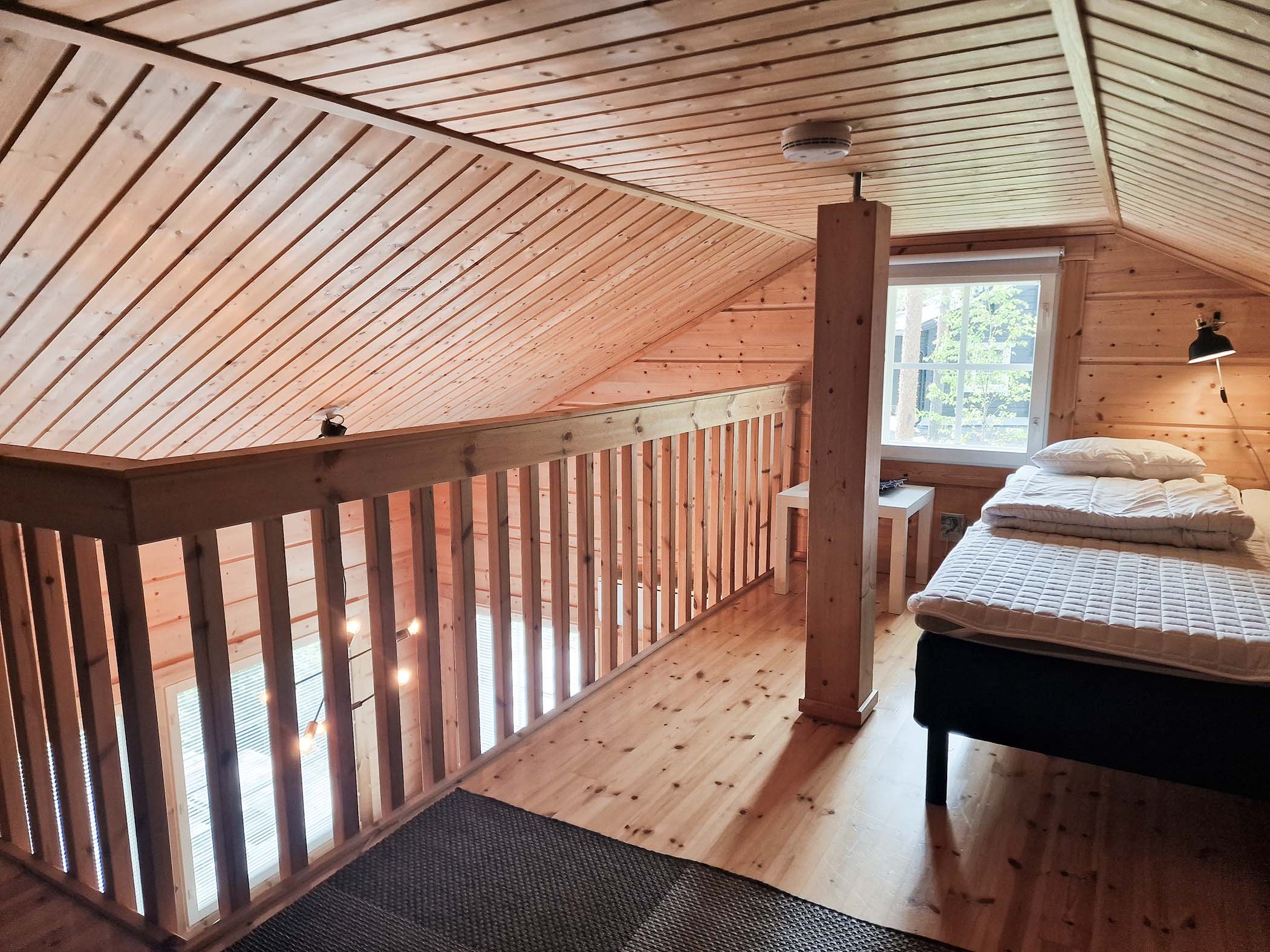 Alakerrassa on olohuone ja keittiö, yksi makuuhuone sekä saunatilat. Yläkerrassa on matala parvi, jossa on sängyt viidelle sekä yksi patja. Pihassa kahden auton parkkipaikka lämpötolpalla.